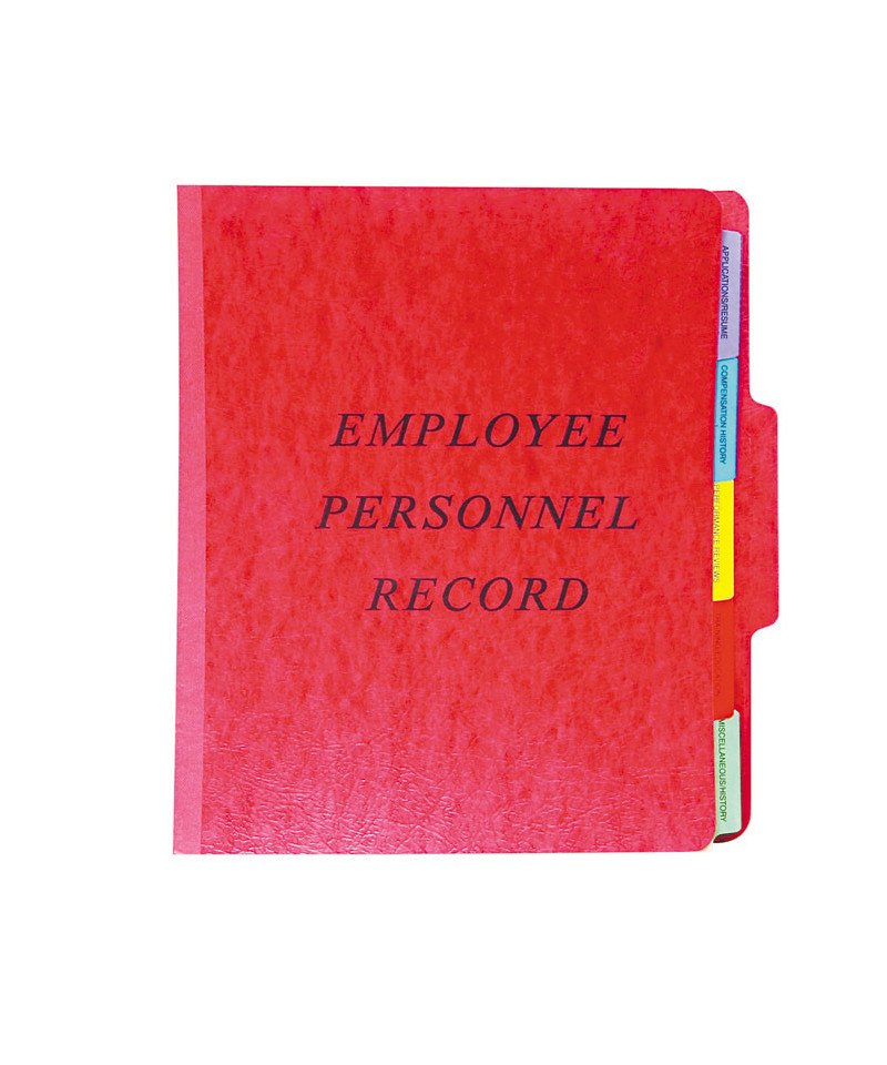 Classification folder with tab in middle position for employee's name. Five Mylar® reinforced tab dividers within folder: Application/Resume, Compensation History, Performance Reviews, Training/Education, Miscellaneous/History. Color-matched reinforced rip-proof tape gusset. 20 pt. covers specially coated to resist moisture. Acid-free.