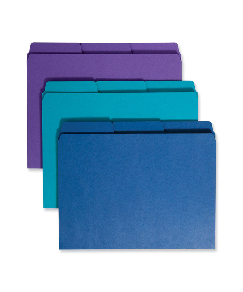 Keep multiple projects and loose documents separate and organized. Find critical files fast with nearly double the labeling area of standard file folders. Smead's SuperTab Organizer File Folders are designed to keep your documents orderly and easy to access. Each top tab file folder features two built-in full-height dividers with a SuperTab 1/3-cut tab, creating three individual sections within a file. Each section expands to 0.75" for extra capacity. Oversized tabs allow for larger or lengthier content descriptions to make finding exactly what you need easier. Useful to keep track of travel files, conference itineraries, and workshop details, keep up with medical info and pet records, or organize complex projects. Includes one purple, teal, and navy blue letter size folder. Designed for drawer and lateral filing, these colorful file folders are ideal for project files, real estate transactions, reports, taxes, and billing. Make workflow easier when you can hand off your documents in a tidy folder. A simple change can boost your productivity and improve your organization. Contain recycled content.