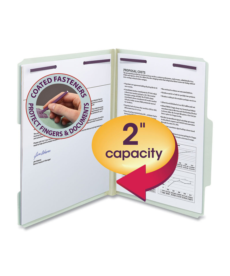 Protect your documents and fingers with Smead™ patented SafeSHIELD® Coated Fastener Technology; the ultimate solution to fastener issues, including paper tears, finger cuts and excessive fastener crinkling. Made for large, bulky files that get plenty of use. Excellent for project files, loans, legal files or anytime you need to keep large amounts of paperwork in sequential order for frequent reference.