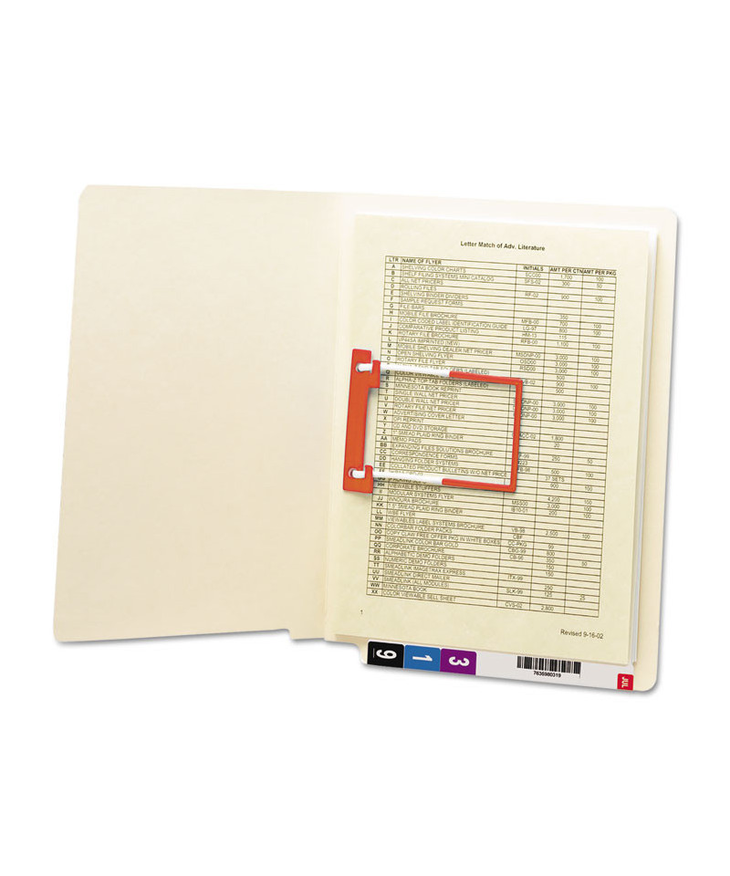 These folders feature straight-cut tabs for color-coded indexing and a U-clip fastener for securing documents inside the folder. Fastener keeps papers secure and in order. One 2" U-style fastener in position number 5. Reinforced tab provides extra strength where it's needed most. Made of 11 point manila stock for everyday use. Expands up to 0.75" for extra storage.