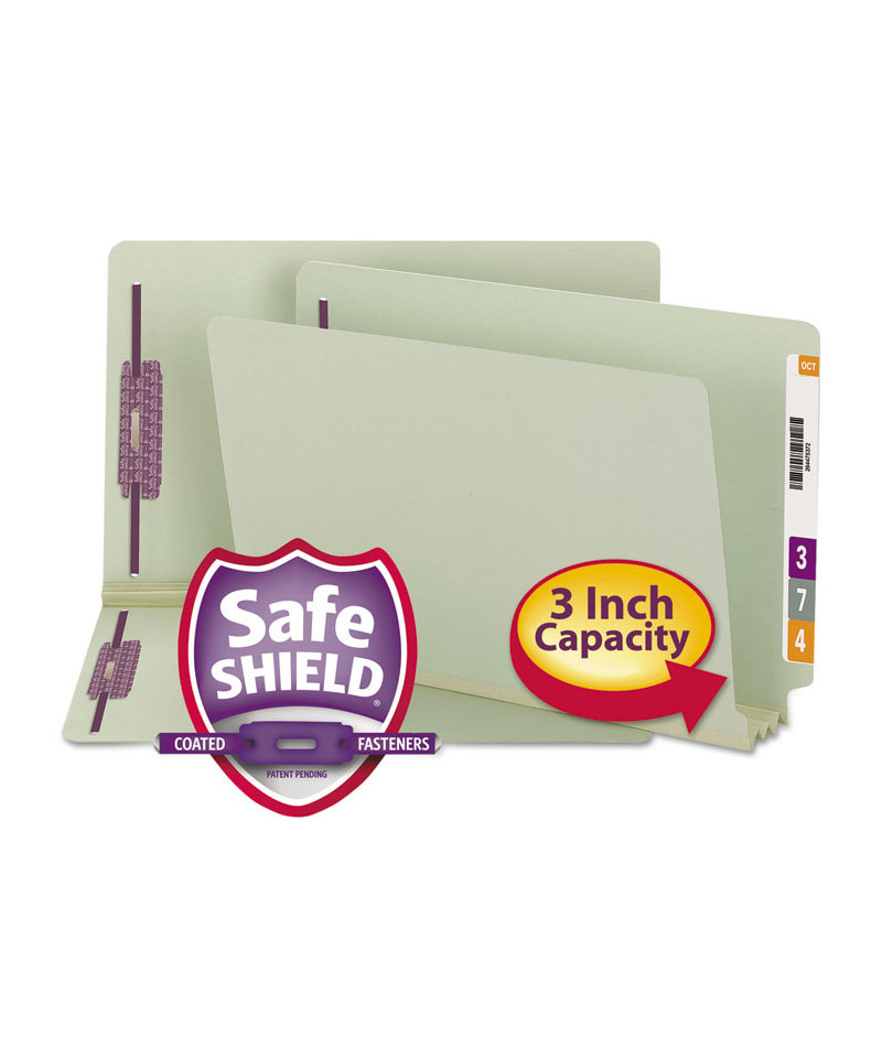 Made for large, bulky files that get plenty of use. Excellent for project files, real estate transactions, loans, legal files, or anytime you need to keep large amounts of paperwork in sequential order for frequent reference. SafeSHIELD® Coated fasteners add protection for papers and fingers while also reducing fastener crinkling. Made of 25 point pressboard stock. Two 2" prong SafeSHIELD® coated B style fasteners in positions number 1 and number 3.