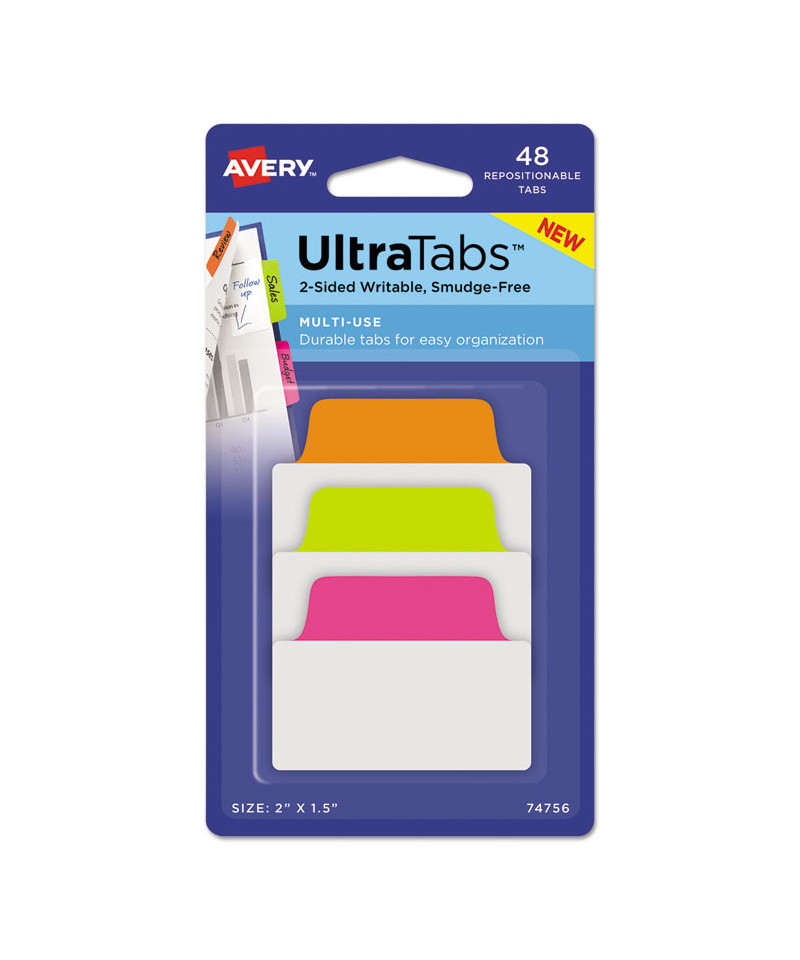 Ultra Tabs Repositionable Tabs, Standard: 2" x 1.5", 1/5-Cut, Assorted Neon Colors, 48/Pack