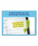 Durable, repositionable and reusable tabs are writable on both sides with a clear adhesive body so you can see text underneath. Tabs stick securely and remove cleanly with no residue. Write on tab and body.