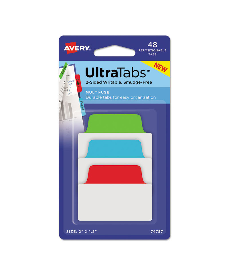 Ultra Tabs Repositionable Tabs, Standard: 2" x 1.5", 1/5-Cut, Assorted Colors (Blue, Green and Red), 48/Pack