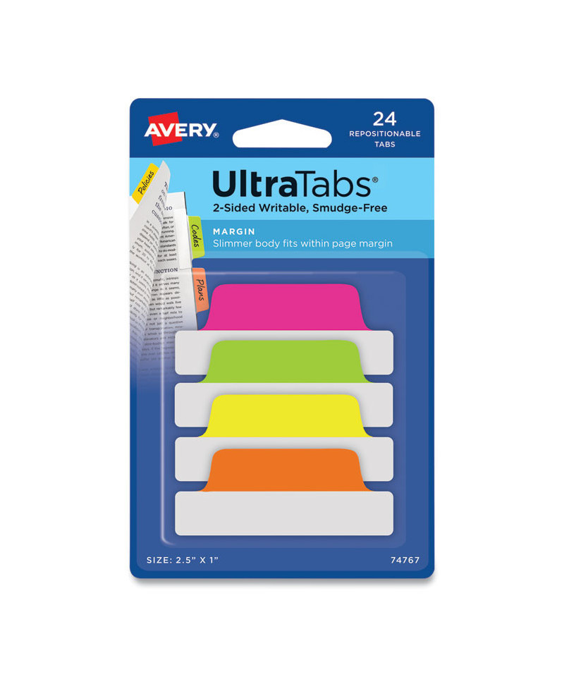 Ultra Tabs Repositionable Tabs, Margin Tabs: 2.5" x 1", 1/5-Cut, Assorted Neon Colors, 24/Pack