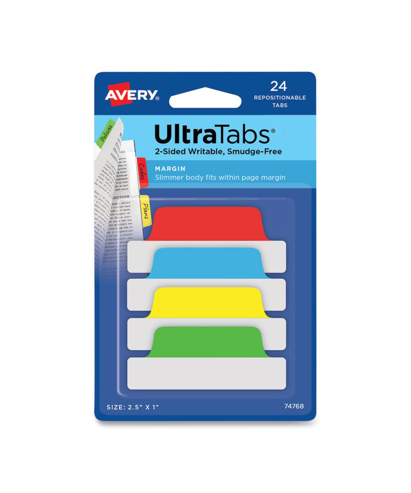 Ultra Tabs Repositionable Tabs, Margin Tabs: 2.5" x 1", 1/5-Cut, Assorted Colors, 24/Pack