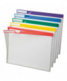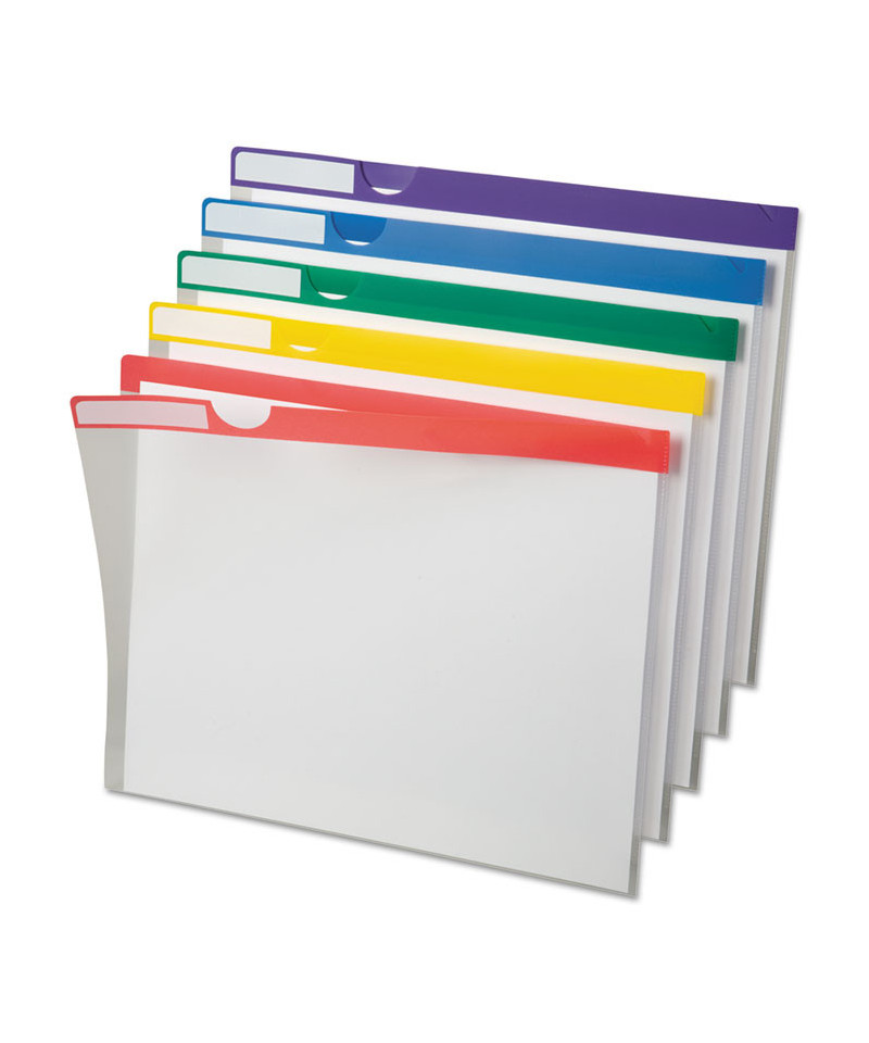 Reference your file categories at a glance. Durable poly folders have color-coded strips, plus white, write-on tab at top for color-coded organization. Top and right side open; thumb-cut for easy access to documents. Water-resistant construction. Clear folders with blue, green, purple, red or yellow strip.