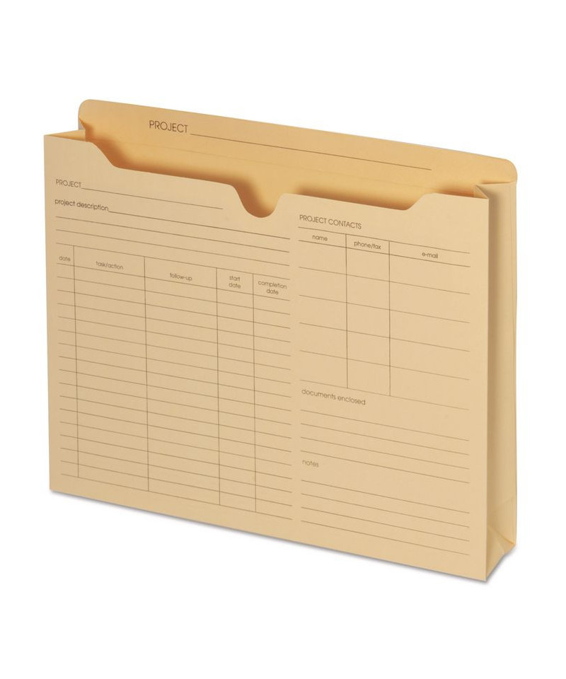 Everything you need to store and record information in one jacket. Track information using the printed-on sections on these standard 11 pt. jackets. Front cover has project grid for timelines, due dates and key contacts. Back cover has section for notes. Double-ply top for durability. Back extends 1/2" for easy labeling.