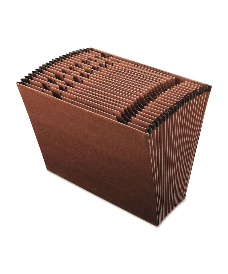 Hard-working and an ideal addition to any office. Leather-look red fiber expanding file features an open top for quick filing and access to filed contents. Convenient preprinted dividers separate papers into easy-to-find categories. Gusset tops reinforced with rip-proof tape to prevent bursting and tearing.
