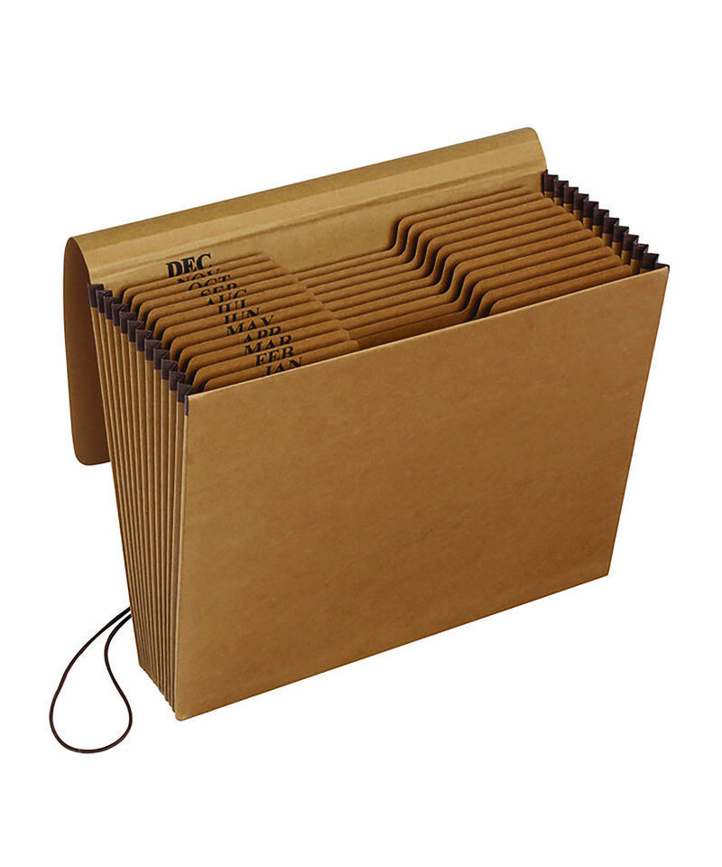 Protect vital documents with this durable, long-lasting expandable file. Double thick front and back panels stand up to active use. Gusset tops are reinforced with rip-proof tape to give you added dependability. Preprinted dividers help keep you organized. Elastic cord closure.