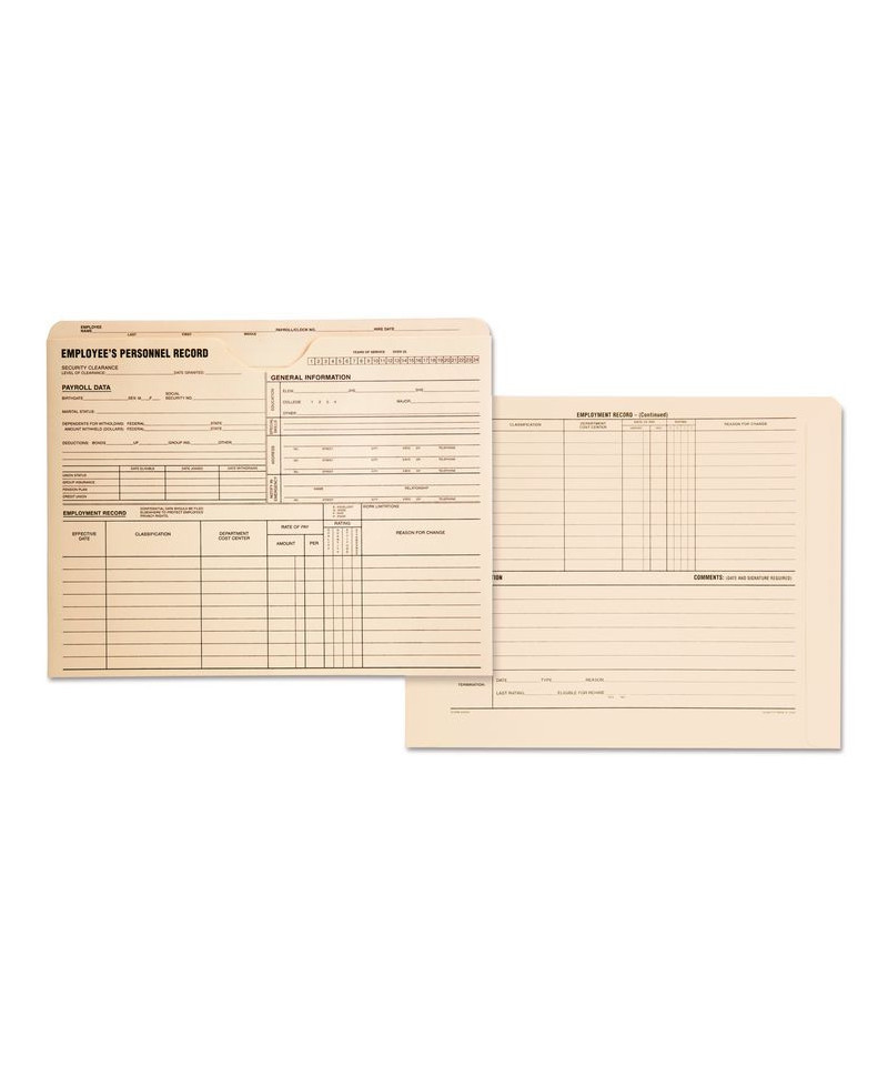Personnel jackets updated with ADA for storing and filing HR records. Employee preprinted record folder keeps records contained in one place to keep you organized. Complete payroll, personnel, employment, accident and termination record is on the outside of the file. Folder complies with the Americans with Disabilities Act (ADA) requirements and EEO-1 information. Made of 11 pt manila tag for durability over time. Folders can be color-coded using systems such as ACCS A-Z labels. Keep all pertinent information for your employees right at your fingertips with these Quality Park personnel jackets.