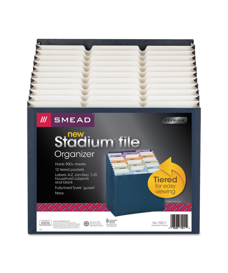 The 12-pocket Stadium® file is ideal for clearing clutter from your workspace or countertop. You can turn piles into files with this tiered expanding file that lets you see everything at a glance. The pockets are tiered and fixed so the papers don't fall to the bottom of the file. It is great for organizing both papers and folders. Fully lined tear-resistant gussets.