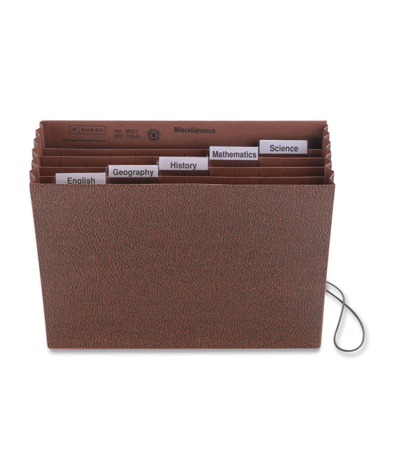 Portable redrope-printed file has six pockets with repositionable clear polypropylene tabs for easy subject identification. Includes both blank inserts and inserts printed with school subjects. Flap with elastic cord secures contents during transport. Six pockets expand to 5.25" to hold up to 700 sheets. Double thick front panel and reinforced double thick back panel for durability. Full-height redrope gussets, reinforced with tear resistant material at top.