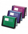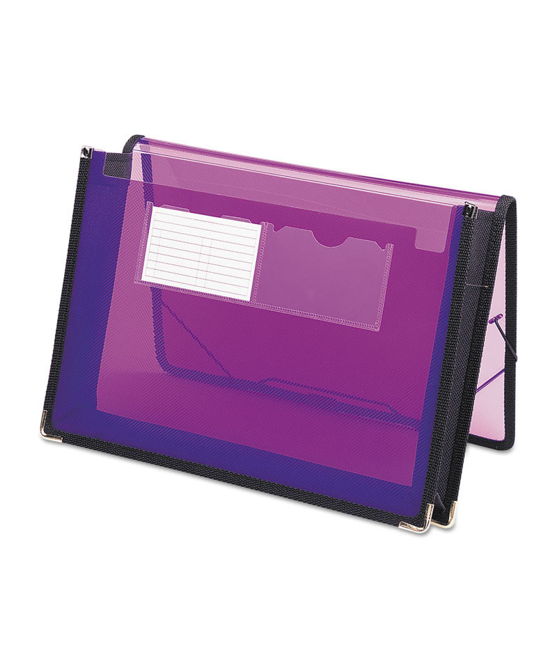Add some fun with these popular translucent colors. Holds up to 200 letter sized sheets and features sewn fabric trim, heavy-duty black cloth gusset, protective cover flap and elastic cord. Durable poly material is tear and water resistant and easy to clean. Expands to 2.25" for extra storage. two clear pockets on front with index card insert included. Extra wide to hold letter-sized folders and papers.