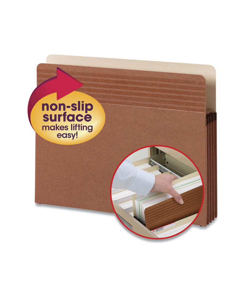 Designed with patented SmeadGrip® Non-Slip Grip to provide twice as much grip as a standard pocket. They require less gripping force to pick up out of drawers or pull off shelves. These sturdy file pockets feature rollover tear resistant reinforcement on the sides that make them virtually tear proof. Closed on three sides to secure and protect documents.