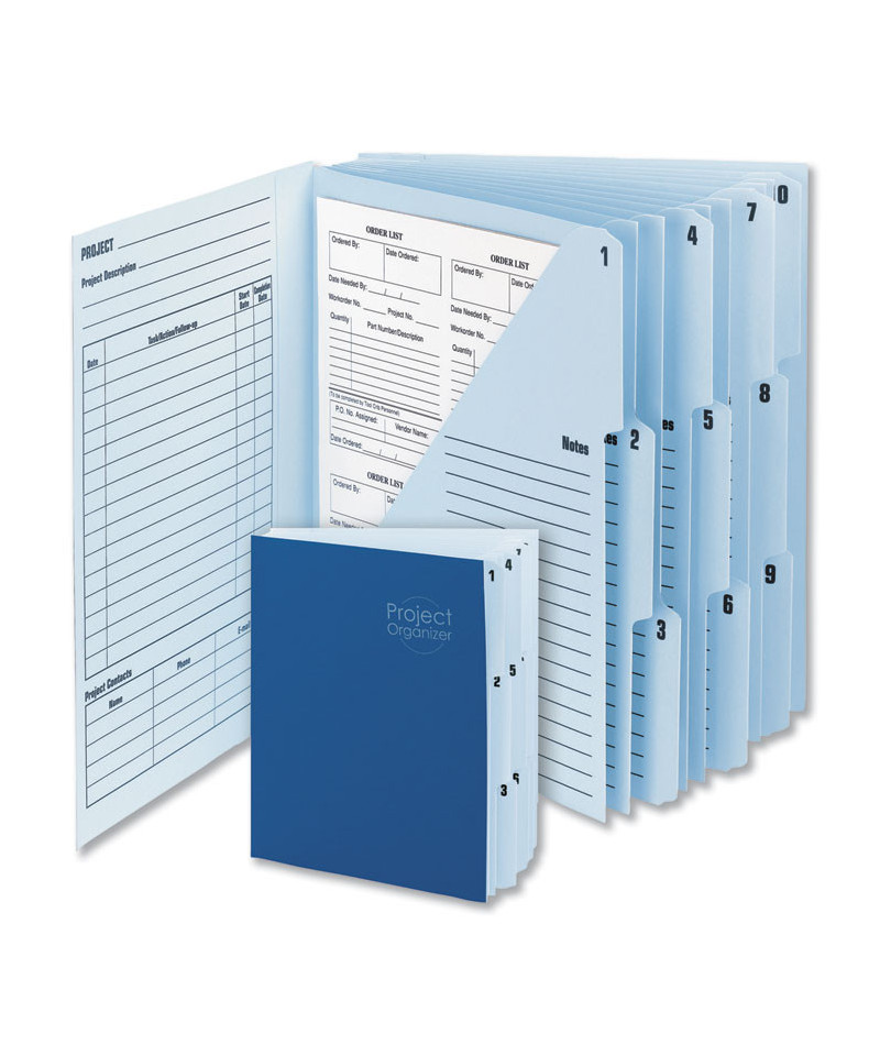 Get organized and stay focused on your projects using project organizers. Smead's Project Organizer keeps all your project's loose papers, notes and documents safe, organized and within reach so you can manage your projects with ease. The letter size project organizer has a navy blue cover, lake blue interior and 10 pockets with closed sides and reinforced tabs. Tabbed and numbered project pockets have a preprinted template for notes, progress and contacts that offers optimal organization. Ideal for home, office or classroom use, this multi-pocket project tracker features double-thick front and back cover and reinforced tabs for added strength and durability. Use this project organizer for important documents, payables and educational materials. Make work flow easier by managing your projects with this useful organizing tool. A simple change can boost your productivity and improve your organization.