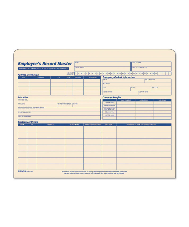 Effectively organize all pertinent personnel documents for each employee. Record and update employment history on the preprinted front side. Holds pre- and post-hiring forms. Closed sides. 10 pt. Manila. Provides space for company benefits, education details and employment records.