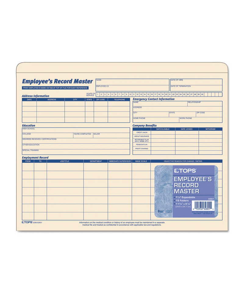 Effectively organize all pertinent personnel documents for each employee. Record and update employment history on the preprinted front side. Holds pre- and post-hiring forms. Closed sides. 10 pt. Manila. Provides space for company benefits, education details and employment records.