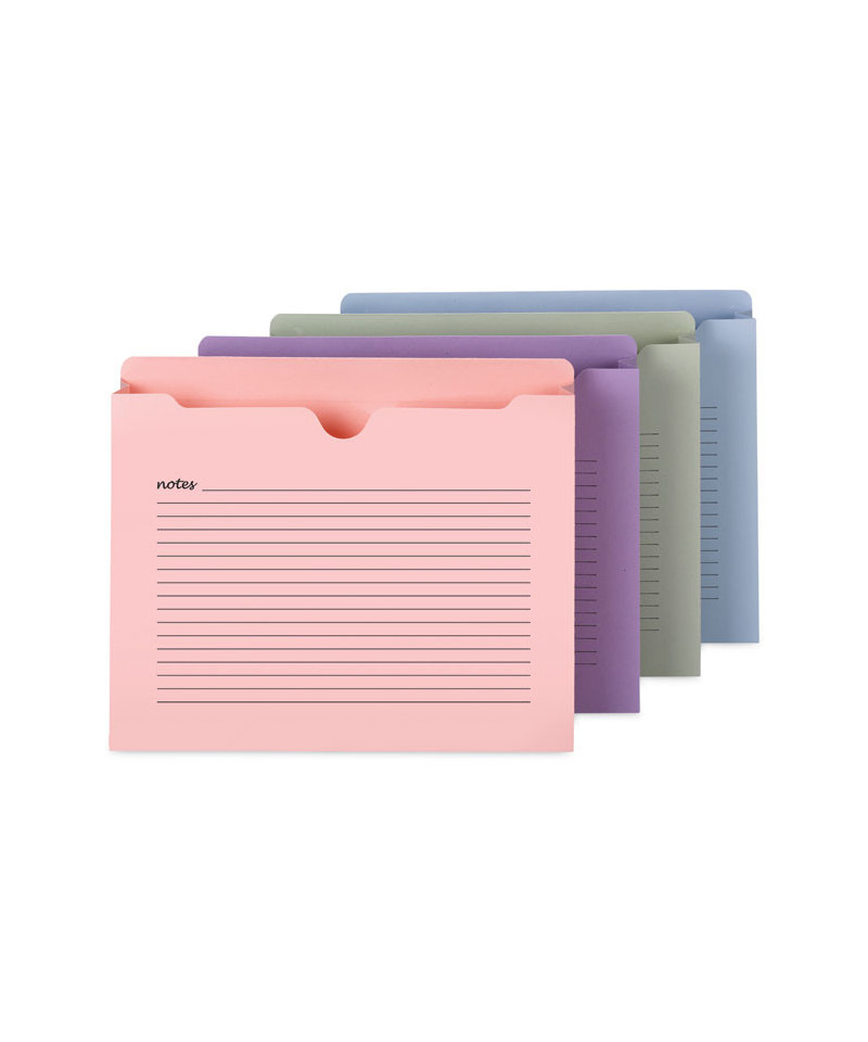 Notes File Jackets eliminate messy scribbles or sticky notes often placed on the outside of files. Keep track of important information directly on the lines on the front and back sides of the jacket. File jackets are closed on three sides for document security and keeping those small incidentals contained. Great for taking files out of the office. Reinforced tabs for extra durability.