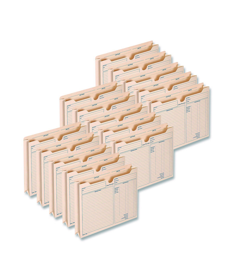 Organize work orders, invoices and other project information with these expanding job folders. Three-sided closures keep paper secure inside, while the thumb-cut fronts offer easy access to the documents stored inside. Each jacket features a preprinted form with inputs for job names, materials, labor costs and other important details. With 2" expansions, these Adams® manila job folders hold thick stacks of paperwork.