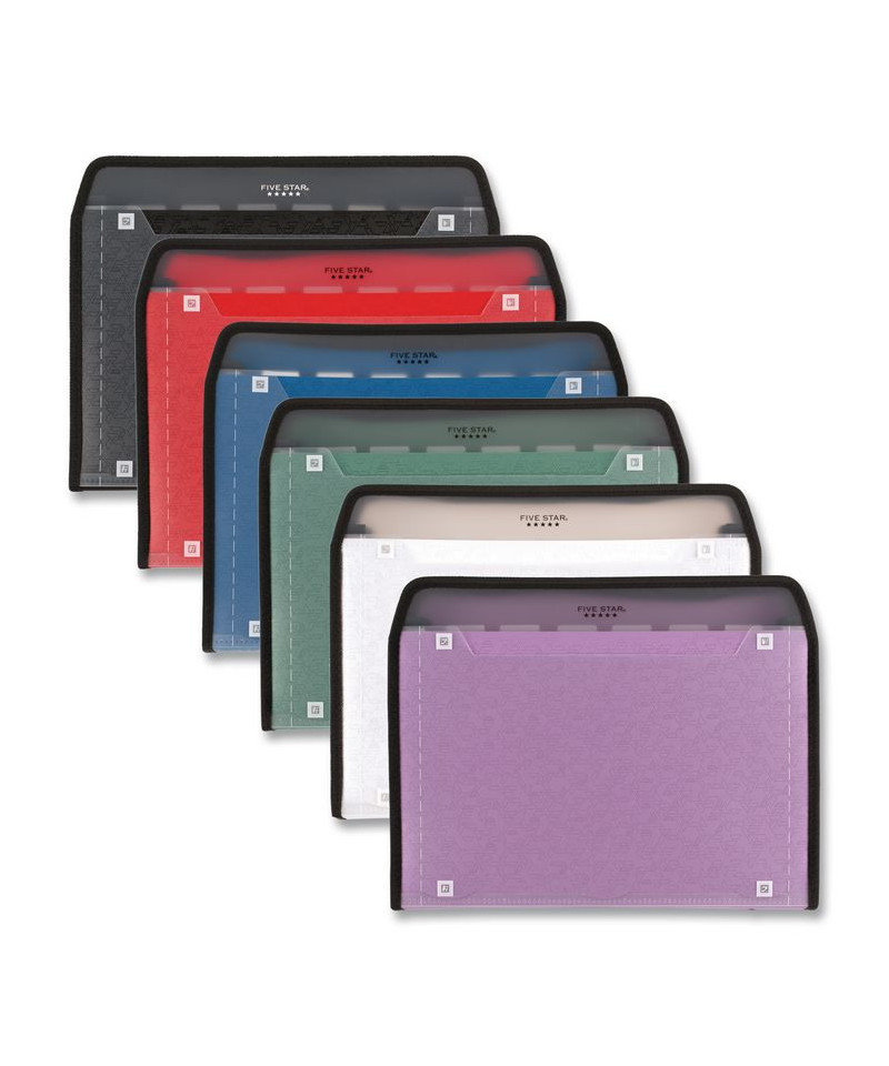 Lasts all year. Guaranteed! Expanding file with color tab inserts offers lots of space for all your school papers. Pull up tabs to help you remember. The tabs easily pull up to serve as a reminder as to what's filed and where. They also help you with prioritization and organization. Sturdy design has a durable plastic outer shell with secure zipper closure to protect those important papers, while reinforced gussets prevent sides from tearing. Its front cover has a clear pocket, so you can display a personalized cover sheet or use for storing more school papers, class assignments or homework due that day. Convenient storage for pens with two loops on the outside of the file. Scan, study and organize your notes with the Five Star App. The clear front pocket on the file makes any paper compatible with the Five Star App, so you can access your notes, handouts and more from any device.