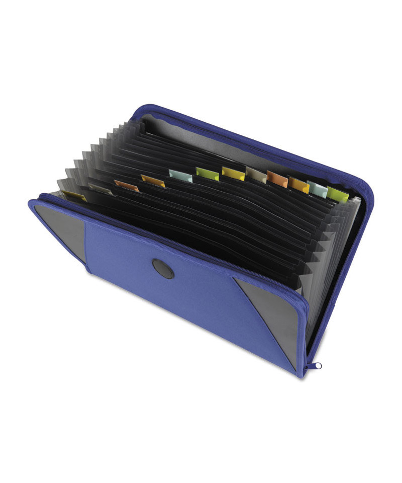 For on-the-go storage, it is important to have a secure solution for paperwork so that it remains protected and organized while being transported. There is no other file that provides more mobile security than the Expanding File with Zipper Closure. Available in a 13-pocket design, this file has a professional soft-sided blue fabric exterior, which makes it a great accessory to carry while traveling. Includes tabbed dividers with customizable color-coded tab inserts. Zipper closure keeps materials safe and secure. Holds up to 300, 8 1/2" x 11" sheets.