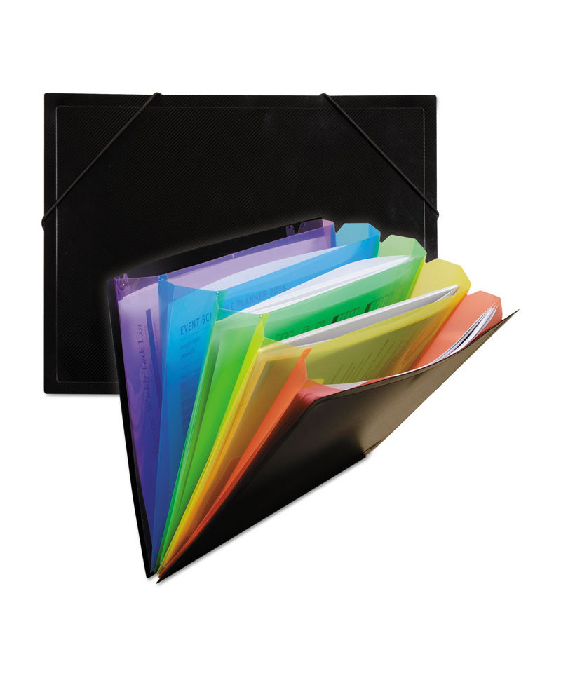 Be stylish on-the-go with this compact, convenient expanding file. Multi-pocket expanding file is made of durable polypropylene. Features a black exterior and five colorful, interior pockets. Holds up to 250, 8.5" x 11" sheets. Transport documents with ease by securing pages with the elastic closure. This product will be cheerfully replaced with one of equal value if defective in materials, manufacturing or packaging at the time of purchase.