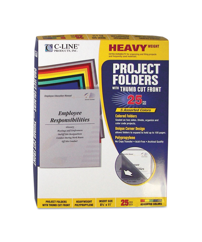Strong, tear-resistant project folder helps to categorize and contain project documents in one accessible location. The folder is sealed on two sides for security and has a thumb cut front to make pages accessible. Could also use folders to separate and organize the contents within a single file folder. Polypropylene material eliminates the potential for photocopy transfer. For 8.5" x 11" document storage. This product will be cheerfully replaced with one of equal value if defective in materials, manufacturing or packaging at the time of purchase. Except for such replacement, this product is sold without warranty or liability even though defect, damage or loss is caused by negligence or other fault.