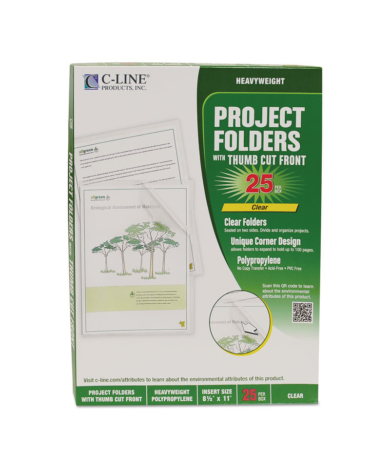 Project Folders are made from heavyweight, acid-free polypropylene. Open two sides with thumb cut front for easy access to documents. Unique corner design allows folders to expand to hold up to 100 pages. Reduced glare. For 8.5" x 11" document storage. This product will be cheerfully replaced with one of equal value if defective in materials, manufacturing or packaging at the time of purchase. Except for such replacement, this product is sold without warranty or liability even though defect, damage or loss is caused by negligence or other fault.