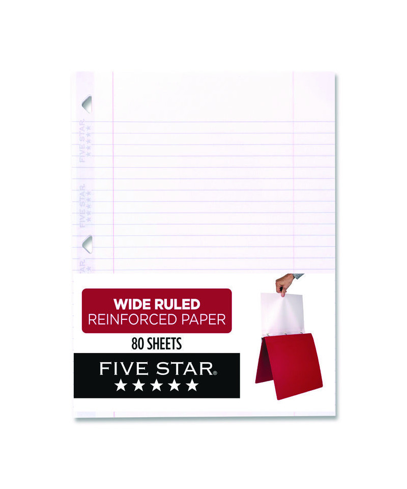 Five Star reinforced filler paper is double the strength with more durable triangle-shaped holes and stronger reinforcement tape to resist tearing. Lasts all year. Guaranteed! Durability at its finest, ruled, reinforced filler paper stays securely in your binder. Heavyweight, 20 lb. paper resists ink bleed and provides a high-quality writing surface for your notes and homework. Double-sided sheets.