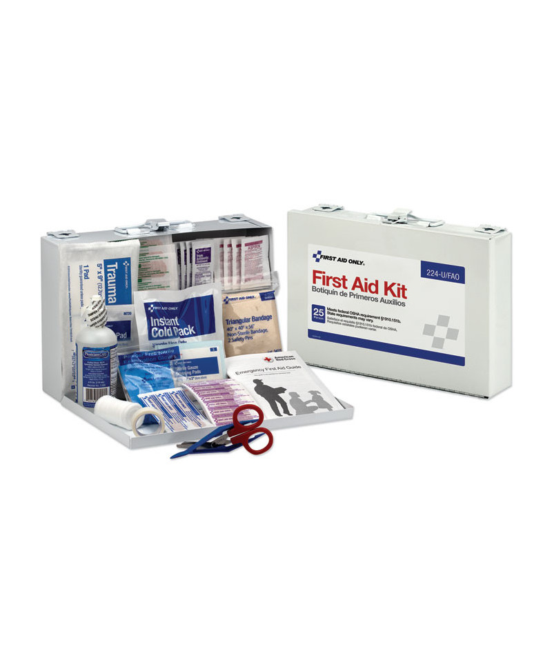 Add to cart First Aid Kit for up to 75 People, Metal, 419 Pieces/Kit $243.60 419 pieces. Organized, compact container makes finding items quick and convenient. Contains a variety of first aid items used to treat most...