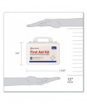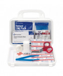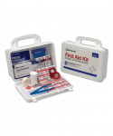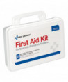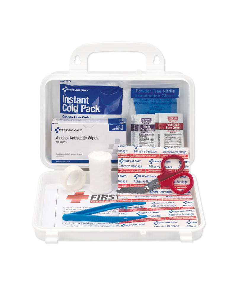 113-piece kit that includes alcohol pads, antibiotic ointment, bandages, first aid cream, instant cold pack, scissors, tape, tweezers, gloves and a first aid guide.