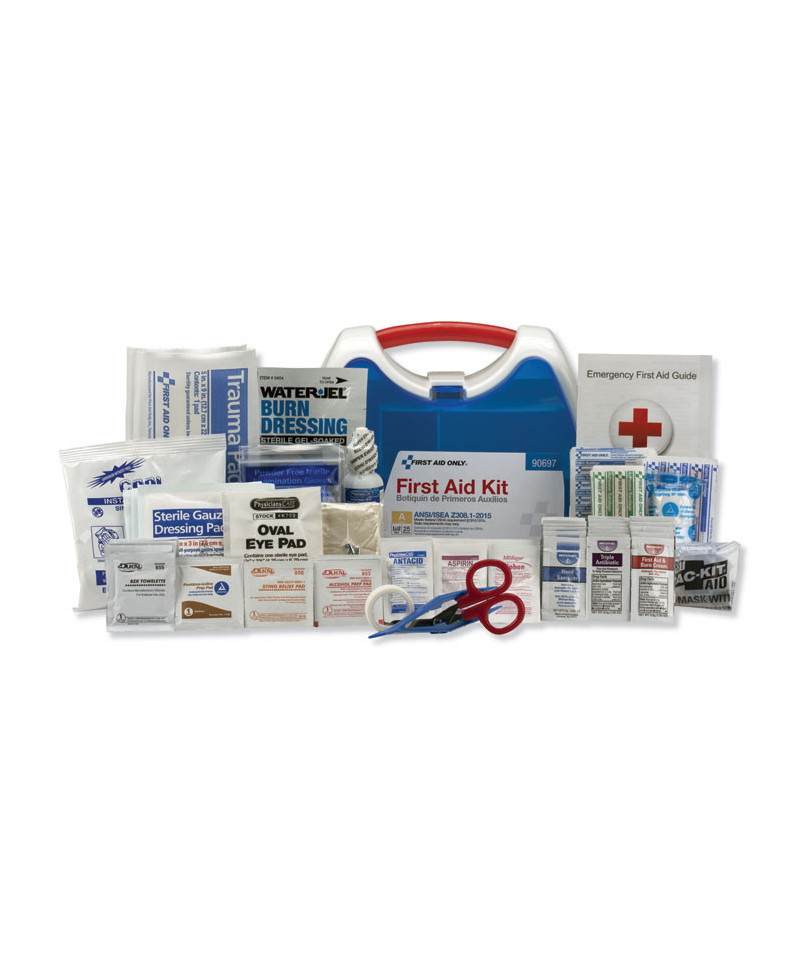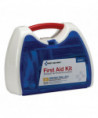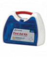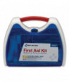 Convenient kit comes in an innovative plastic case with a carrying handle. Comes complete with all of the items needed to clean, treat and protect against a variety of everyday occurrences. Transparent door allows you to find items quickly in an emergency. Kit is conveniently wall mountable.