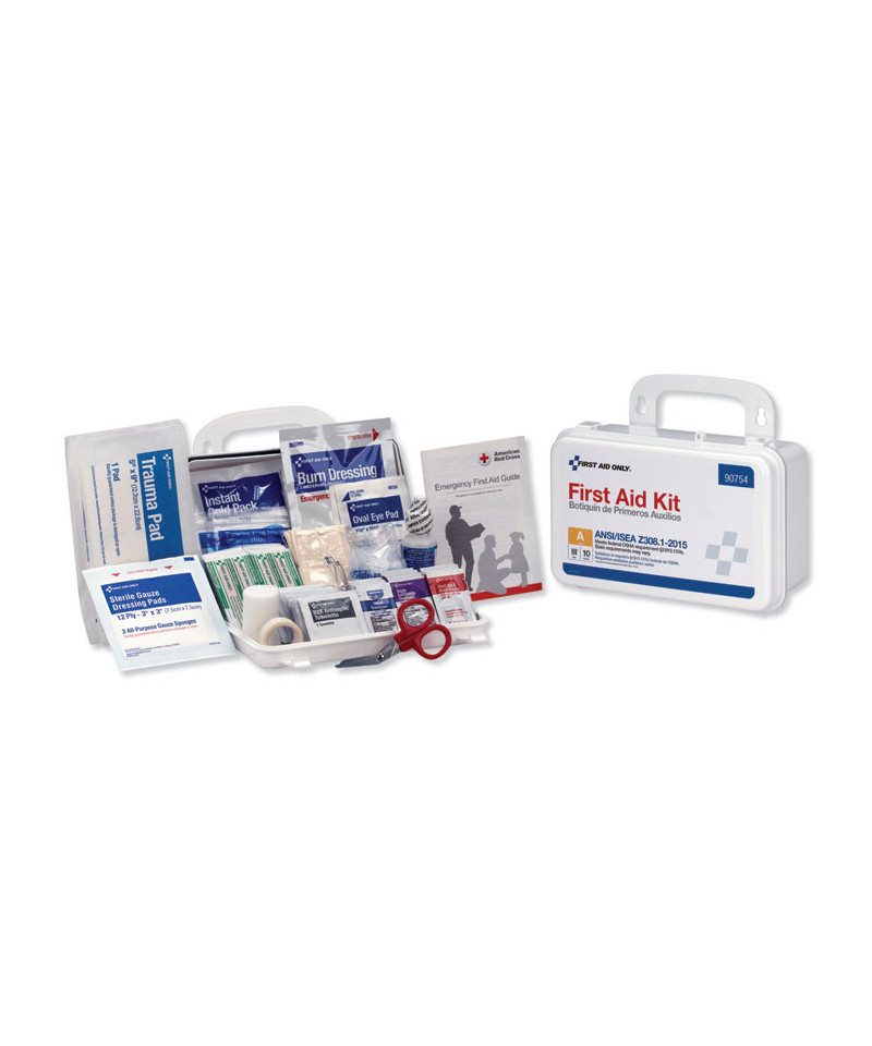 Convenient weatherproof case comes with a carrying handle. Case is easily wall mountable. Contents exceed the 2015 ANSI Class A requirements and are sufficient to treat up to 10 people.