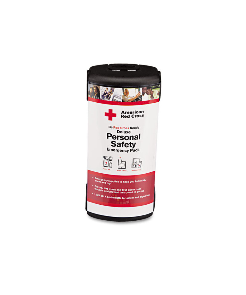 Deluxe personal preparedness pack containing a wide assortment of essential items that can be used during a catastrophic event or emergency. Includes exam-quality vinyl gloves (2), adhesive plastic bandages (5), adhesive fabric bandages (3), junior adhesive plastic bandages (5), sting-free antiseptic cleansing wipes (2), germicidal wipes (2), hand warmers (2), knuckle fabric bandage, fingertip fabric bandage, triple antibiotic ointment pack, hand sanitizer pack, emergency drinking water, emergency poncho, 38" x 60" emergency blanket, whistle with neck cord, light stick and N95 mask.