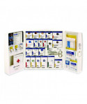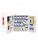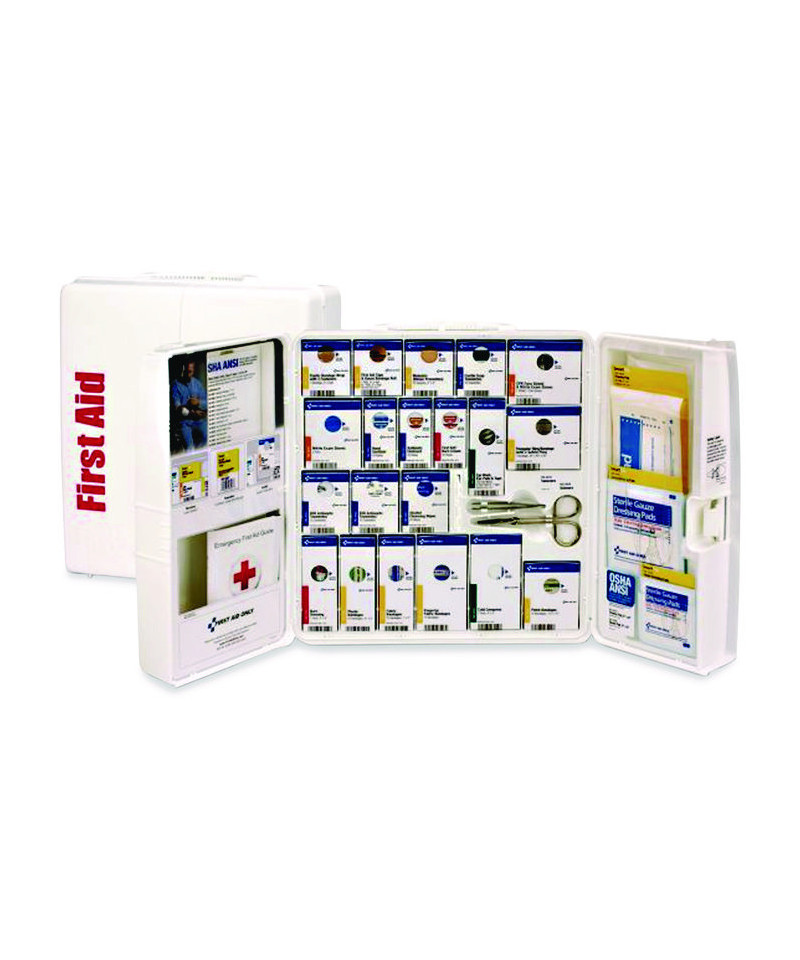 Keep medical supplies organized and accessible with this 50-person general business plastic first aid cabinet. With enough supplies to take care of up to 50 people, this first aid cabinet is an ideal pick for offices, schools and other large businesses. The included pain relief medication keeps the workplace prepared for headaches, joint pain and other ailments. Durable plastic case comes with a carrying handle and can be placed on a wall or other flat vertical surface.