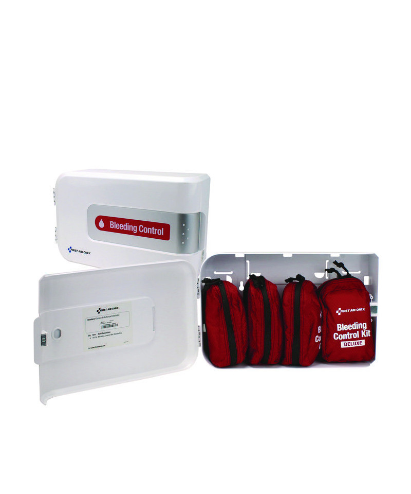 The SmartCompliance Complete Bleeding Control Station - Deluxe Pro is designed for multiple-person bleeding traumas that might occur in a variety of locations including workplaces or public spaces. This clearly labeled, aesthetically-appealing wall-mountable cabinet has a push-plate door opening so there is no fumbling with locks and latches in a hurry. The SmartCompliance Bleeding Control Cabinet includes four Deluxe Pro Bleeding Control Kits (91138). Each pouch contains all the tools required to handle serious multiple-wound limb or torso bleeding wounds. It is equipped with a windlass-style and a back-up limb tourniquet, a blood-clotting hemostatic gauze pad, a chest seal for lung wounds, a highly absorbent Israeli bandage and additional wound dressings.