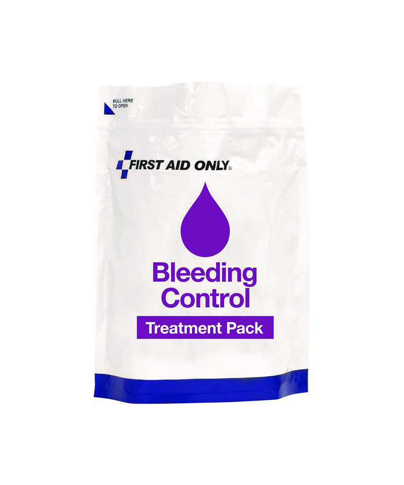 Quick convenient kit has essential supplies to treat bleeding control emergencies. Contains windlass tourniquet and hemostatic blood-clotting gauze pad to treat bleeding injuries. Grab-and-go treatment pack stands on its own and is easy to carry to an emergency, Each first aid item's intended use is printed on the back of the bag. Bag is resealable. Sold as a separate treatment pack or as a refill for the 91170 Emergency Response Bag.