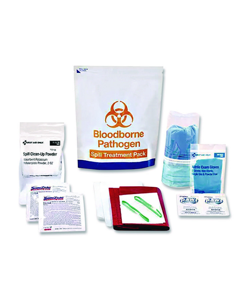 Quick convenient bloodborne pathogen kit has essential supplies. OSHA mandated Bloodborne Pathogen kit with protective apparel and clean-up supplies. Grab-and-go treatment pack is able to stand on its own and easy to carry to an emergency. Each first aid item's intended use is printed on the back of the bag. Sold as a separate treatment pack or as a refill for the 91170 Emergency Response Bag.