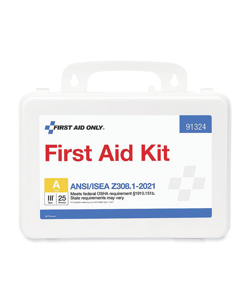 This 94-piece, 25-person bulk first aid kit by First Aid Only™ is designed for use in small offices, vehicles, and work sites. The weatherproof plastic case is wall-mountable, yet has a handle for easy carrying.