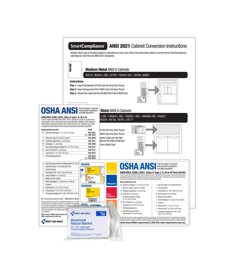 Upgrade a current SmartCompliance cabinet to the ANSI A 2021 standards with this conversion pack. This kit contains both the components as well as the labels and content card to convert any ANSI A SmartCompliance cabinet so it meets the new ANSI A 2021 standards. Instructions included so it is easy to understand where to place each item.