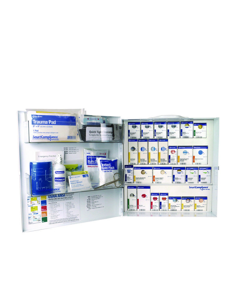 SmartCompliance large metal 2021 ANSI B first aid cabinet without medications for food service delivers cost savings and a convenient replenishment system that keeps a business ANSI compliant.