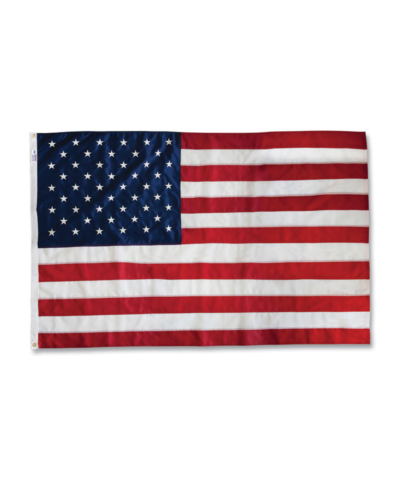 A premium United States flag made of durable, all weather, heavyweight nylon. Features sewn stripes and embroidered stars within white canvas headings and brass grommets for unparalleled resistance to weather and outdoor conditions.