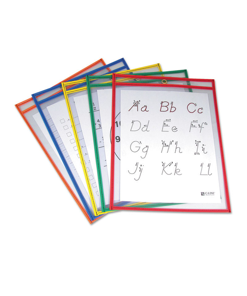 Reusable Dry Erase Pockets, Super Heavy-Duty, Top Load 9 x 12 Insert, Clear Front, Assorted Border Colors, 5/Pack