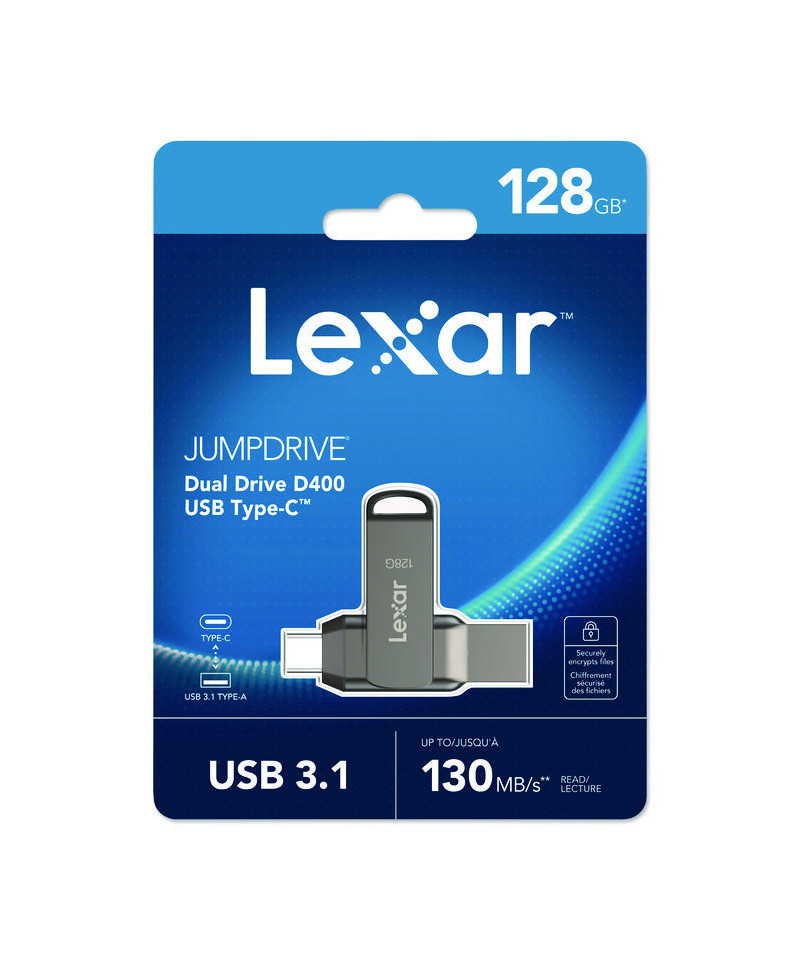 The Lexar JumpDrive D400 is a two-in-one flash drive that allows you to seamlessly transfer content between your USB Type-C and Type-A devices. Featuring a stylish metal casing and swivel design for added protection, this drive is as tough as it is fast, with transfer speeds up to 130 MBps.