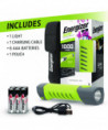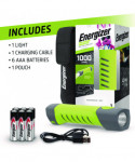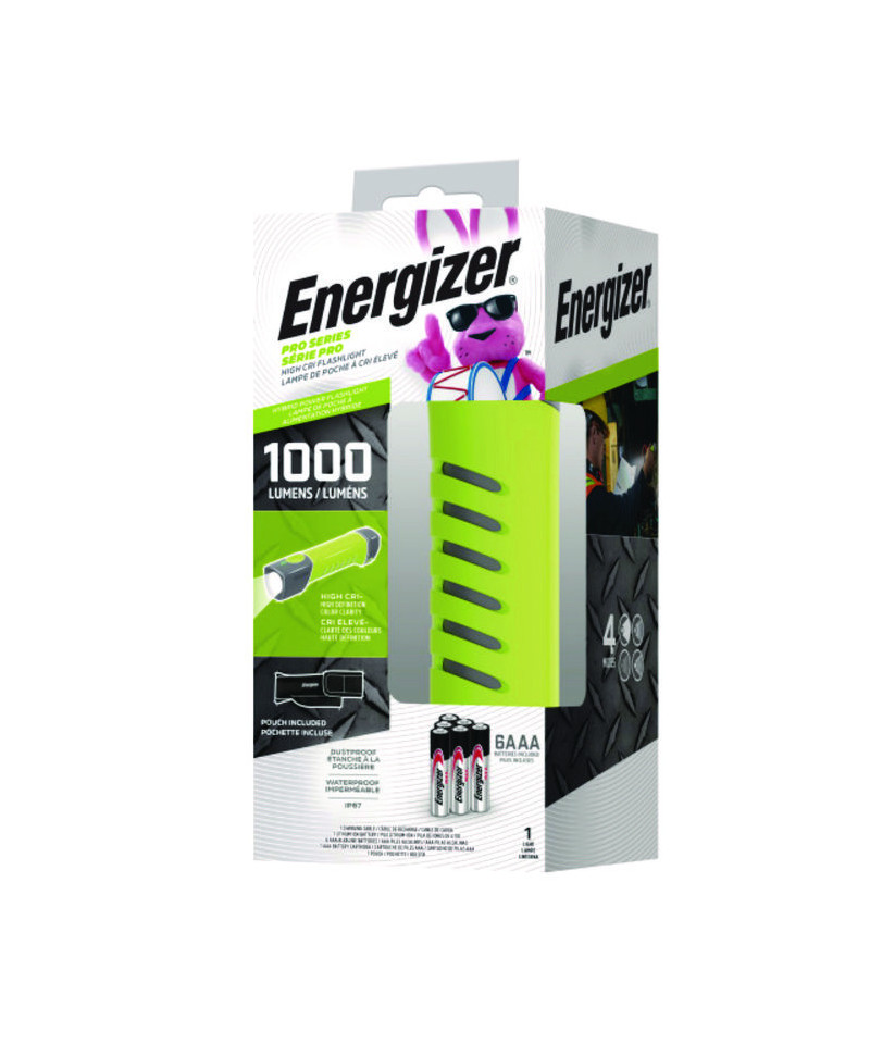 Energizer Hybrid Pro Series Handheld High CRI Flashlight maximizes your performance and durability to meet the tough standards and demands of your job. This handheld flashlight features powerful LED technology with High CRI for high-definition color clarity to enhance your safety with increased visibility. You can power up this hybrid flashlight with 6 AAA batteries (included) or recharge via USB (charging cable included). With 1,000 lumens, this LED light offers intense lighting and has a beam distance spanning nearly 1.5 stadium fields. Durable, waterproof and dustproof, this flashlight withstands demanding conditions. The anti-roll design and magnet attachment provide a steady base for hands-free operation or storage. It also features a large push-button switch that is easy to use with gloves on and a non-slip grip for easy carry. Plus, a pouch is included to attach to your belt while easily storing your light, batteries, cartridges and charging cable all in one place. Colorful, the green color lets you easily find this bright flashlight in your toolbox. It's recommended to use this durable LED flashlight in emergency situations or as a work flashlight. Trust in Energizer to deliver the powerful performance we promise Energizer lights are tested and adhere to strict, reliable ANSI standards.