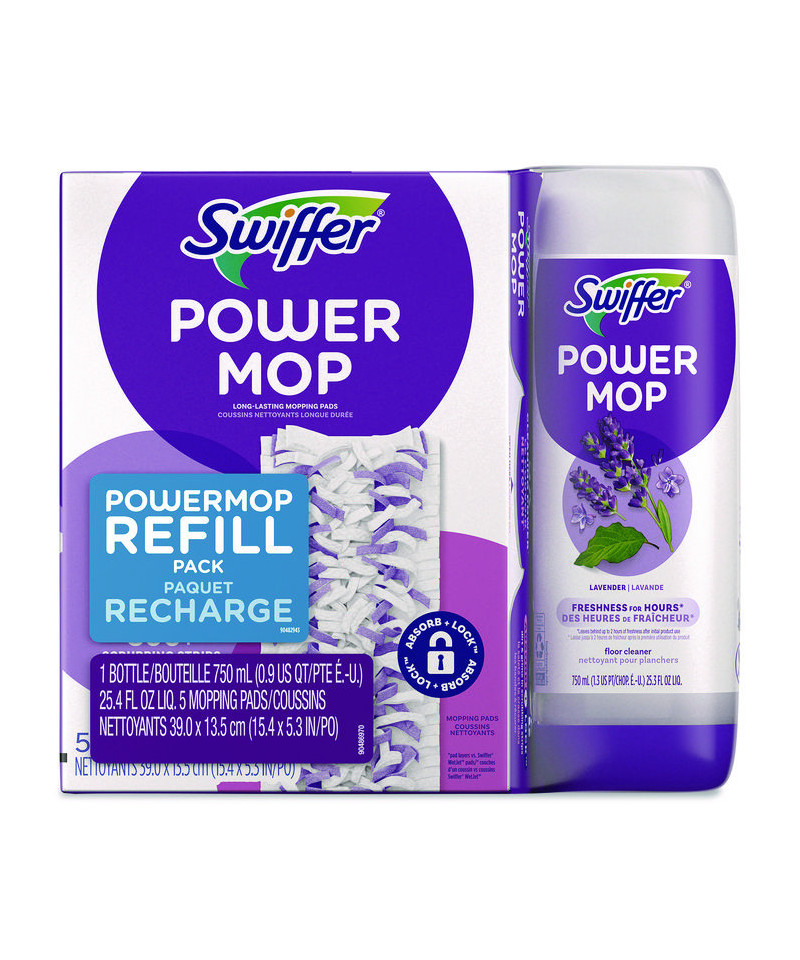 Mop smarter with the Swiffer PowerMop, an all-in-one mopping system that gives you a mop and bucket clean in half the time. The multi-surface mopping pads have 300+ scrubbing strips that reach deep into grooves and grout to remove sticky spills and daily dirt and grime. The pre-mixed floor cleaner breaks down tough, sticky messes and dries fast, no need to rinse!