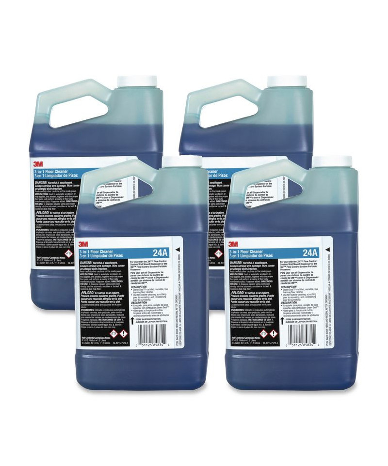 Maintain cleaner, healthier floors with 3M™ 3-in-1 Floor Cleaner Concentrate 24A, your all-in-one solution for efficient, professional-grade floor care. This Green Seal Certified™ cleaner is formulated for a variety of floor maintenance tasks—daily cleaning, deep scrubbing before recoating, and preparing surfaces for burnishing. Its low-foaming formula is ideal for automatic scrubbers and mop-on applications, saving time and effort across commercial or industrial cleaning jobs. With a powerful yet gentle formulation, it won't damage floor finishes and requires no rinsing, helping to streamline your cleaning process and reduce labor costs. It effectively eliminates salt and quat residue build-up, leaving behind a clean, fresh scent and spotless shine. Designed to work seamlessly with the 3M™ Flow Control Chemical Management System, this 0.5-gallon concentrate bottle provides up to 132 gallons of ready-to-use solution thanks to a precise 1:256 dilution ratio.