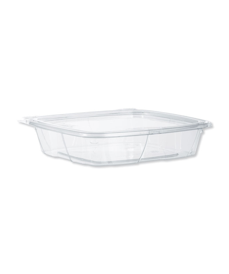 No matter what's inside, these containers keep your food safe, secure and looking good! Designed to prevent tampering without shrink bands or extra wrapping, our containers make sharing food easy. Keep contents fresh and prevent leaks with the secure perimeter seal. The tamper alert hinge has a visible seal that, if broken, makes it obvious the container has been opened. The specialty lid inhibits the ability to lift it from the base without tearing the hinge. Once the seal is broken, the now two-piece container is easy to re-close and continues to be leak-resistant. Make sure your food is the star of the show thanks to the crystal-clear material. Merchandising and delivery is a breeze the sturdy stackable design. They're even great for at-home use. Transport salads, fruits, or desserts to your next picnic, potluck, or bake sale.