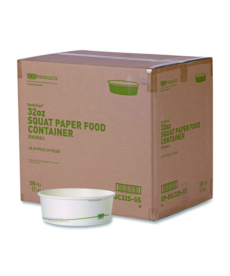 Choose Eco-Products® Compostable GreenStripe PLA-Lined Paper Food Containers for a sustainable solution to food service. These disposable containers are made from renewable, plant-based materials and are designed for easy composting. They offer convenience for high-volume needs and are compatible with available lids to keep contents secure. These containers meet rigorous standards for compostability and sustainability, making them the ideal choice for your business.